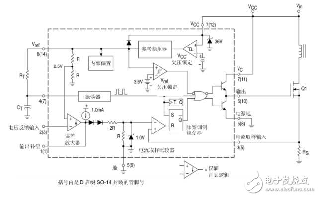 关于电路功能的讲解到这里差不多结束了,从分析过程中可以看得出来,输出的占空比波形与采样的峰值电流是相关的,所以这款芯片是峰值电流控制型芯片,而另一路电压输出反馈回路,可以看作是电流反馈信号的比较上限值,电压反馈回路响应时间长,又加了积分补偿电容,像PI算法一样,可以减小误差,使占空比调制趋于稳定。这些控制芯片的内部结构大同小异,掌握了该芯片的分析方法后,可以尝试去分析其它控制芯片的结构,便于以后更好地使用芯片。