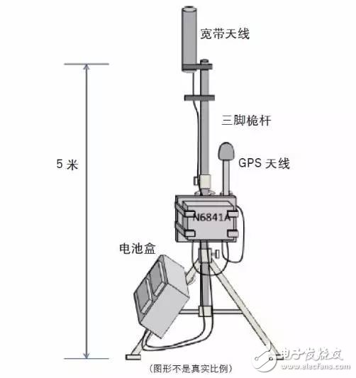 这次外场测试是2017年5月下旬在北京官厅水库附近实施的,主要由三台小型室外监测站点组成(使用四台或以上的监测站点通常能够达到更好监测效果和定位精度)以及 N6820ES Signal Surveyor 4D软件和N6854A定位服务器软件组成。每套监测站点的典型配置如下所示: