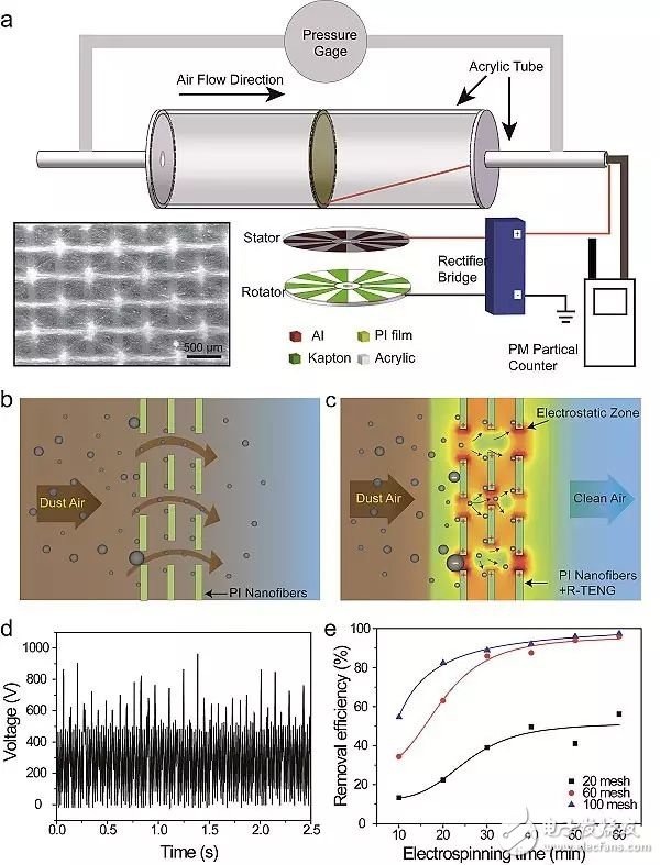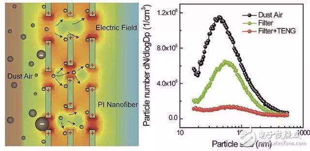 中国科学院北京纳米能源与系统研究所的王中林院士和李从举研究员(共同通讯作者)开发了一种高效旋转摩擦纳米发电机(R-TENG)增强型聚酰亚胺(PI)纳米纤维空气过滤器,用于环境气氛中PM的去除。研究人员对不同粒径的PM进行了过滤去除实验,得到了具有指导意义的实验数据。这种空气净化和雾霾处理的方法,具有零臭氧释放和低压降的优异性能。