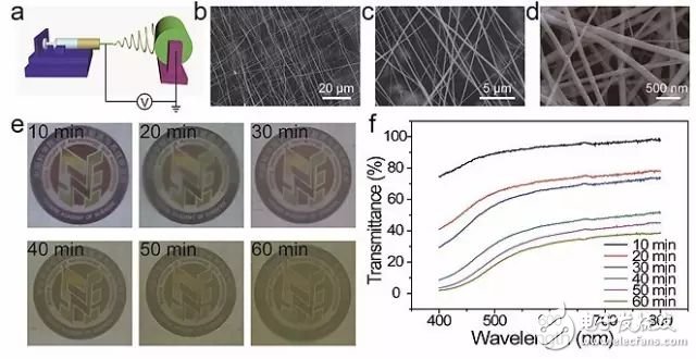 图2. PI纳米纤维的制造、结构与透射光谱。(a)通过静电纺丝制造PI空气过滤器的示意图;(b)(c)(d)具有不同放大倍率的PI空气纳米纤维的SEM图像;(e)静电纺丝时间为10至60分钟的PI过滤器照片;(f)不同纺丝时间对应PI纳米纤维膜的透射光谱。