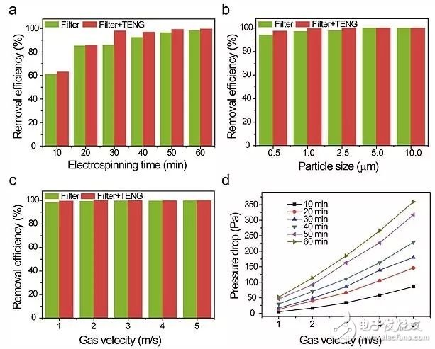图4. 不同因素对PM去除效率的影响。(a)不同静电纺丝时间下,不同过滤器(是否具有R-TENG增强)的PM2.5去除效率;(b)60分钟静电纺丝时间下,不同过滤器(是否具有R-TENG增强)对不同尺寸PM的去除效率;(c)不同气体速度下,不同过滤器(是否具有R-TENG增强)PM2.5的去除效率;(d)不同气体速度下,不同纺丝时间的过滤器压降情况。