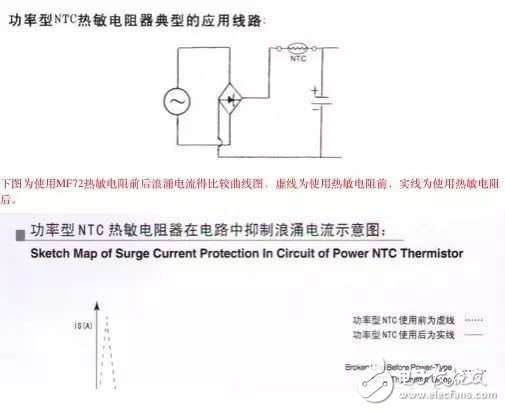 为了避免电子电路中在开机瞬间产生的浪涌电流,在电源电路中串接一个功率型NTC热敏电阻,能有效的抑制开机时的浪涌电流,并在完成浪涌电流抑制作用后,由于通过其电流的持续作用,功率型热敏电阻的阻值将下降的一个非常小的程度,它消耗的功率可以忽略不计,不会对正常的工作电流造成影响,所以在电源回路中使用功率型NTC热敏电阻,是抑制开机浪涌电流保护电子设备免遭破坏的最为简便而有效的措施。