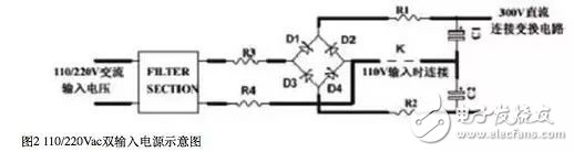 浪涌电流的抑制方法有很多,一般中小功率电源中采用电阻限流的办法抑制开机浪涌电流。图2是一个常见的110V/220V双输入电源示意图,以此为例,我们分析一下如何使用NTC热敏电阻进行浪涌电流的抑制。