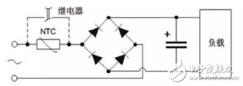 上述使用NTC浪涌抑制器的电路与使用固定电阻的电路相比,已经具备了节能的特性。对于某些特殊的产品,如工业产品,有时客户会提出如下要求:1、如何降低NTC的故障率以提高其使用寿命?2、如何将NTC的功耗降至最低?3、如何使串联了NTC热敏电阻的电源电路能适应循环开关的应用条件?对于第1、2两点,因为NTC热敏电阻的主要作用是抑制浪涌,产品正常启动后它所消耗的能量是我们不需要的,如果有一种可行的办法能将NTC热敏电阻从正常工作的电路中切断,就可以满足这种要求。对于第3点,首先分析为什么使用了NTC热敏电阻的产品不能频繁开关。从电路工作原理的分析我们可以看到,在正常工作状态下,是有一定电流通过NTC热敏电阻的,这个工作电流足以使NTC的表面温度达到100℃~200℃。当产品关断时,NTC热敏电阻必须要从高温低阻状态完全恢复到常温高阻状态才能达到与上一次同等的浪涌抑制效果。这个恢复时间与NTC热敏电阻的耗散系数和热容有关,工程上一般以冷却时间常数作为参考。所谓冷却时间常数,指的是在规定的介质中,NTC热敏电阻自热后冷却到其温升的63.2%所需要的时间(单位为秒)。冷却时间常数并不是NTC热敏电阻恢复到常态所需要的时间,但冷却时间常数越大,所需要的恢复时间就越长,反之则越短。在上述思路的指导下,产生了图3的改进型电路。产品上电瞬间,NTC热敏电阻将浪涌电流抑制到一个合适的水平,之后产品得电正常工作,此时继电器线圈从负载电路得电后动作,将NTC热敏电阻从工作电路中切去。这样,NTC热敏电阻仅在产品启动时工作,而当产品正常工作时是不接入电路的。这样既延长了NTC热敏电阻的使用寿命,又保证其有充分的冷却时间,能适用于需要频繁开关的应用场合。