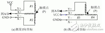 触摸屏的两个金属导电层分别用来测量X轴和Y轴方向的坐标。用于X坐标测量的导电层从左右两端引出两个电极,记为X+和X-。用于Y坐标测量的导电层从上下两端引出两个电极,记为Y+和Y-。这就是四线电阻触摸屏的引线构成。当在一对电极上施加电压时,在该导电层上就会形成均匀连续的电压分布。若在X方向的电极对上施加一确定的电压,而Y方向电极对上不加电压时,在X平行电压场中,触点处的电压值可以在Y+(或Y-)电极上反映出来,通过测量Y+电极对地的电压大小,便可得知触点的X坐标值。同理,当在Y电极对上加电压,而X电极对上不加电压时,通过测量X+电极的电压,便可得知触点的Y坐标。测量原理如图1所示。