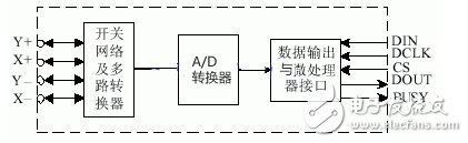 触摸屏控制器有多种,主要的功能均是在微处理器的控制下向触摸屏的两个方向分时施加电压,并将相应的电压信号传送给自身A/D转换器,在微处理器SPI口提供的同步时钟作用下将数字信号读入微处理器。控制器ADS7846基本结构如图2所示。