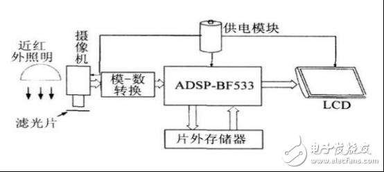 整个静脉识别系统由静脉图像采集+静脉图像识别两部分模块组成,其中静脉图像由普通黑白模拟摄像机在近红外光照下获取,而图像后期处理工作则交由 ADSP-BF533 实现静脉图像细化、特征提取和识别。