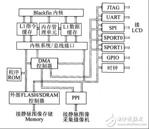 ADSP-BF533 有专门的外部 FLASH/SDRAM 控制器。FLASH 用来存储采集到的静脉图像及标准静脉特征信息。SDRAM 用来做图像数据的高速缓存。 ADSP-BF533的串行接口(SPI)外接LCD,输出识别结果。同时如果将来对系统进行功能扩展的话,LCD也可以作为人机交互的重要渠道。