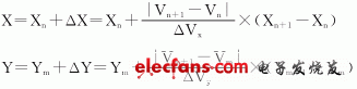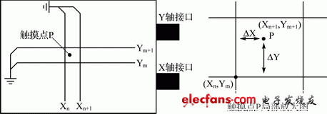 其中,Xn,Ym、 Xn+1,Ym+1是已知坐标,ΔVx、ΔVy为已知常数,ΔVx是触摸笔在Xn轴上时Vn与Vn+1的差值,ΔVy则是触摸笔在Ym轴上时Vm与Vm+1的差值。