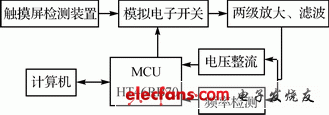 触摸屏控制电路整体结构如图3所示。当用触摸笔触摸LCD显示屏时,触摸检测装置对应的X、Y轴上会分别感应到一个信号,这个信号经过模拟电子开关,然后经两级放大、滤波,将得到的信号分两路处理,一路是电压整流,另一路是频率检测电路;得到的数据通过MCU HT46RB70计算,判断出触摸屏的位置及触摸的方式,再由MCU将触摸信号发送到计算机,最终实现触摸输入。整个触摸屏控制电路的时序都是由单片机控制的,其他模块的电路见后面的详细介绍。