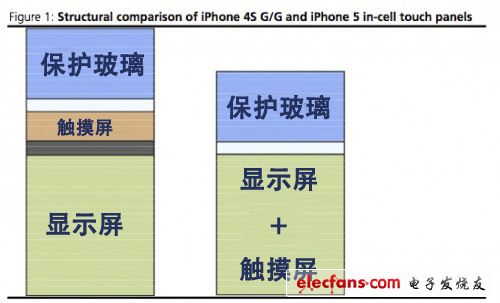 两者的共同点均可以减少贴合次数,这样也就可以达到节省成本提升贴合的良品率。另外由于少了一层触摸层,从而也可以达到节约材料成本和实现轻薄化的目的,而其中苹果iPhone5 就是采用了In-Cell的技术。