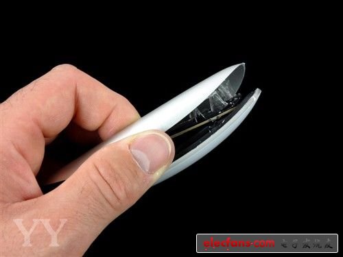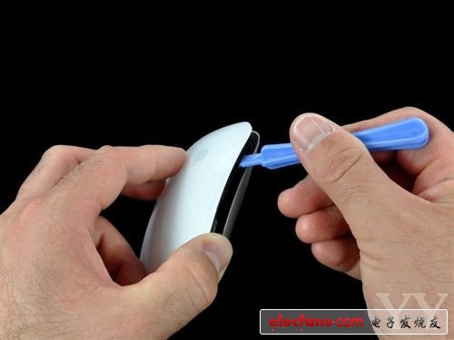 这款Magic Mouse鼠标采用了苹果独有的无缝Multi-Touch技术设计,表面光滑平整切无螺丝固定。它的外壳是通过内部黏胶固定,所以需要用硬物沿边缘翘起。(为了不损坏外壳,在这里建议采用钝器具)