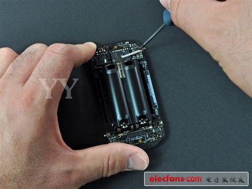 进一步拆解PCB电路板,上方是它的电池仓位,由5颗螺丝固定在主电路板之上,拆除时需要小心不要损坏电路。