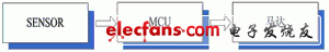 智能小车系统原理是,将三维坐标传感器安装在小车上,小车即具有智能感知功能,就会随着目标物的前后左右移动而跟着移动。系统主要有3个组件:一为三维坐标光感传感器(ETOMS-ET21X111),用于采集目标物的移动坐标,该传感器使用非常简单;二为MCU(EMC-EM78P156),读取传感器数据控制马达转动,EM78P156是市面上常见的MCU,使用简单,价格便宜;三是马达,马达选用普通直流马达即可,采用PWM控制。系统整体框架如图1所示。