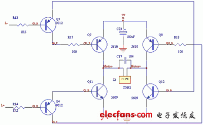 左路马达控制电路如图4所示。右路马达控制电路同左路的一样,图中Q3、Q4采用PNP管,L和L+不可同时为LOW,以免造成短路。