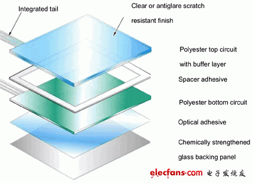 一般电阻式架构式Film on Glass(FG),也就是说上层是ITO Coating的PET,下层则是以ITO Coating的一般玻璃,缺点是一般玻璃假如在使用中不慎弄破,玻璃碎片会割伤使用者。