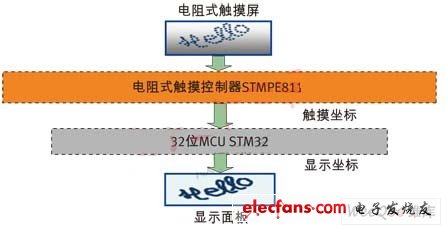 为了弄明白电阻式触感解决方案的原理,我们分析一个现成的低成本手写板解决方案(图 4)。在这个实例中,电阻触摸屏控制器采用ST的先进STMPE811控制器,主处理器采用ST的STM32高密度32位微控制器。