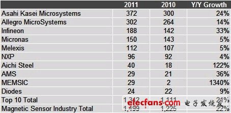 其余在全球前十大磁感测供应商排行榜内的,还有年度营收9,600万美元、第六大业者NXP;排名第七大的日商Aichi Steel,年度营收4,000万美元。同样排名第八的业者有两家业者,分别为奥地利业者AMS (austriamicrosystems),以及美商Memsic,2011年度营收都是2,900万美元。排名第十的则是美国的Diodes,年度营收为2,400万美元