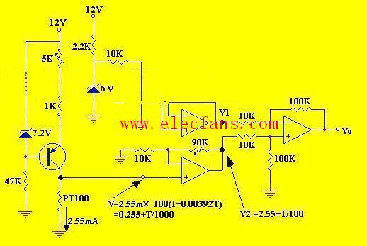 1:Vo=2.55mA ×100(1+0.00392T)=0.255+T/1000 。