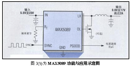 TVS;6.5V至76V宽输入电压范围;承受高达80V汽车甩负载;高性能,满载下具有92%的高效率,无负载时310μA低静态电流,19μA低关断电流;为严酷的汽车环境而设计,确保工作在-40℃至+125℃结温范围内,打嗝模式短路保护,保持器件凉态,热关断和短路限流。上述功能可整合在5mm X 5mmTQFN封装内。3.2频率最高并具有宽输入电压范围(5V至23V)的2A DC-DC转换器MAX5089见图3(b)示意。 其特征为:2.2MHz开关频率,避免噪声干扰 敏感的AM波段或ADSL2+频段;5V±10%或5.5V至23V的宽Vin范围,适合宽广的汽车电压范围和对xDSL和机顶盒的宽电压范围墙上适配器进行稳压及用于控制7V至14V的粗调中间总线电压非常理想;高效,同步整流驱动器允许在宽Vin范围内实现最高效率。 图3(b)为MAX5089功能与应用示意图。