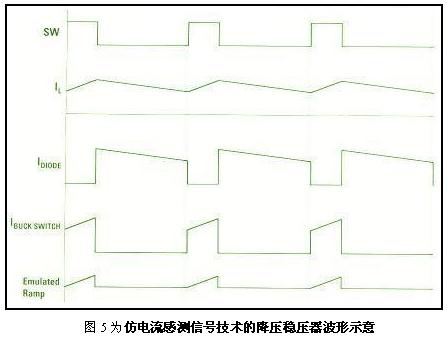 模拟降压开关电流,而无需真正测量电流,避开测量的准确性问题。以降压稳压器来说,电感器电流是降压开关电流及自由轮转(续流)二极管电流的总和(图5为仿电流感测信号技术的降压稳压器波形示意),降压开关电流波形由两个部分组成,其中有基本或消隐电平信号,也有斜波信号。消隐电平信号是整个开关周期的最低电感器电流值(谷值)。当降压开关启动,而自由轮转(续流)二极管关闭的一瞬间,电感器电流便处于最低值。电感器电流处于谷值时,降压开关及二极管的电流也同样处于其最低值。我们可以在降压开关启动前利用采杆及保持的方法进行采样,以测量自由轮转(续流)二极管的电流,所得的测量数值可以用来捕捉消隐电平信号。
