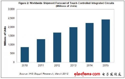 在苹果公司iPhone和iPad畅销的推动下,智能手机和媒体平板中的触控屏急剧增长,从而导致触摸控制器集成电路(IC)出货量在短短五年内将增长近两倍。