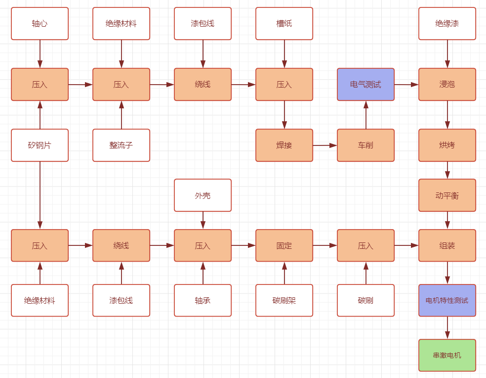 接下来的插图显示了串激电机的生产流程,其中,白色标记的部分表示材料,橘色表示生产过程,蓝色则代表检测程序,最终电机产出以绿色标识。在插图上部是转子的生产程序,下部则是定子的生产程序。