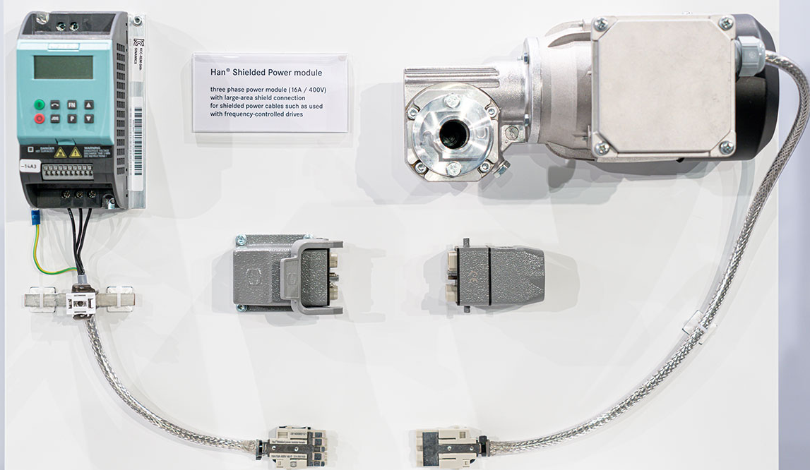 电源电缆连接的模块化和接合。像这种屏蔽电源模块,具有用于连接常规三相负载的三个电力触点和一个PE触点,两个用于温度监控、制动器的信号触点,以及能够让电缆屏蔽以更优的EMC合规实现连接的大面积屏蔽层。