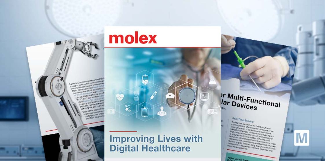 2022年3月18日 – 专注于推动行业创新的知名新品引入 (NPI) 分销商™贸泽电子 (Mouser Electronics) 宣布与Molex携手推出全新电子书《Improving Lives with Digital Healthcare》(通过数字医疗改善生活),探索连接与医疗设备设计交叉领域的创新解决方案和应用。本书中,来自Molex和贸泽的行业专家通过多篇深度好文,探讨了新一代的数字医疗解决方案,包括机器人手术、医疗可穿戴设备、脑机接口,以及采用沉浸式技术的医疗培训。
