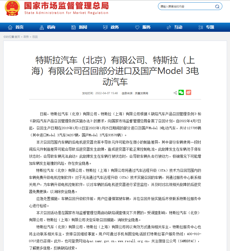 近日,特斯拉向国家市场监督管理总局备案了召回计划,自2022年4月7日起,召回生产日期在2019年1月11日至2022年1月25日期间的部分进口及国产Model 3电动汽车,共计127785辆(其中进口Model 3汽车34207辆,国产Model 3汽车93578辆)。目前特斯拉给出的解决办法是OTA升级。