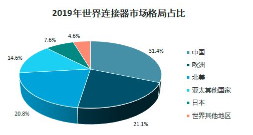 根据智研咨询发布的数据显示:2019年中国大陆连接器市场规模是227亿美金,和2018年同期比较增长率8.4%,占全世界31.4%的市场份额,是世界最大的连接器销售市场。