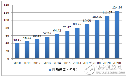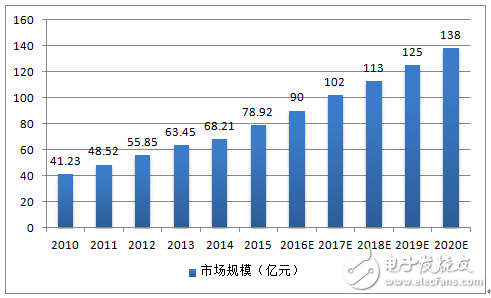 2010-2020 年中国射频连接器市场规模(亿元)