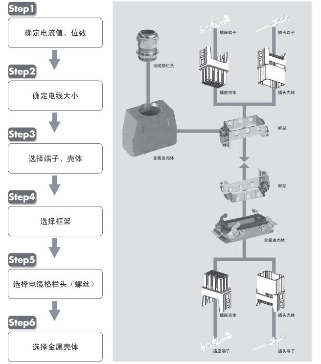 为以前选择的各连接器元件选择合适的金属壳体。可安装M32的电缆格栏头,从HTS样本中选择3模块式(尺寸6)的金属外壳。电线取出方向为水平式,选择两侧锁的金属壳体。