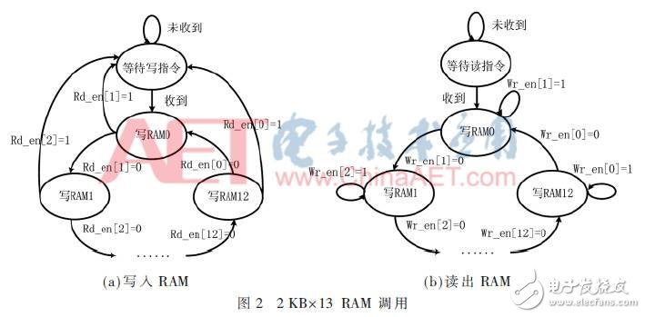 缓存数据写入RAM的过程如图2(a)所示。系统在接收到RAM的写指令后,首先向RAM0写入采集到的数据。当RAM0写满后,若RAM1处于忙状态(即Rd_en[1]=1,系统从RAM1中读出数据),则终止写入,系统回归初始状态,等待写指令,否则无间断地向RAM1中写入数据。由此依次对RAM0至RAM12这13个存储器进行循环操作,完成数据的写入。该RAM写操作机制能够保证数据流的实时、不间断,符合数据采集要求。而缓存数据的读出过程如图2(b)所示。系统在接收到RAM的读指令后,首先从RAM0中读出数据,将其传送至FX2的Slave FIFO。完成RAM0的读操作后,若RAM1处于空闲状态(即Wr_en [1]=0,系统未向RAM1写入数据),则无间断地读取RAM1中的缓存数据,否则等待RAM1完成写操作之后再继续进行读操作。对RAM0至RAM12这13个存储器进行循环读操作,直到采集结束。