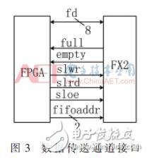 数据传送即通过FX2 的Slave FIFO模式,将从RAM中读出的数据上传至上位机PC并保存,其高速数据传送通道接口图如图3所示[5]。在开始传送数据前,需通过Slave FIFO的切换地址fifoaddr配置Slave FIFO为2′b10,使其能够向FX2的Slave FIFO写入数据。接收到数据传送指令后,主程序实时监控Slave FIFO的空满标志empty、full。当发现Slave FIFO未满时,通过控制Slave FIFO的写时钟slwr,将从RAM读出的数据传送至Slave FIFO的双向数据端口fd,构成了高速数据通道,完成数据上传。