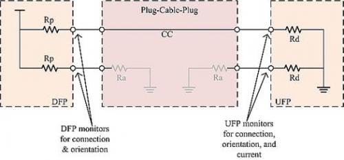 即使一个插座有2个CC引脚,CC1和CC2,一条电缆内也只连接了单条CC电线。对于每个CC引脚,DFP具有一个上拉电压,而UFP有一个下拉电压。监视CC引脚上的额定电压提供了方向和连接检测。