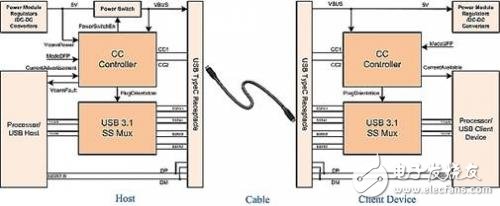 图3中显示的是USB Type-C的典型主机-客户端 (DFP/UFP) 实现方式。USB 3.1主机的一个示例就是台式机或笔记本电脑。PC中的Type-C端口与DFP类似,运行为一个USB主机,为客户端设备供电。另一方面,一个USB SuperSpeed客户端设备的典型示例就是便携式硬盘。这个硬盘运行为一个USB设备,并且由VBUS供电。