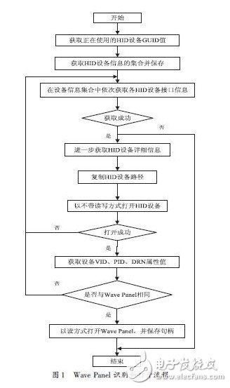 HID 设备连接到主机后,以厂商ID(VID)。产品ID(PID)和产品版本号(PVN)三项属性值的组合作为设备唯一标识.Wave Panel 的三项属性值可以从产品说明书直接获取。由于一台主机可能同时连接有多台HID 设备,所以在通讯前应用程序必须要识别并打开Wave Panel,这一过程需要调用多个Windows API函数实现。基本方法是首先获取当前与主机连接的所有HID 设备信息的集合,然后逐一枚举集合中的各设备,并比较VID.PID 和PVN 值。当三项属性值都与Wave Panel 相等时表示已经找到,调用CreateFile()将该Wave Panel 打开,并保存Wave Panel 设备句柄。该模块的流程如图1 所示。