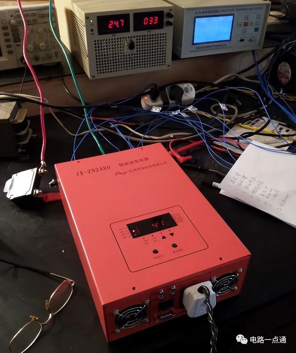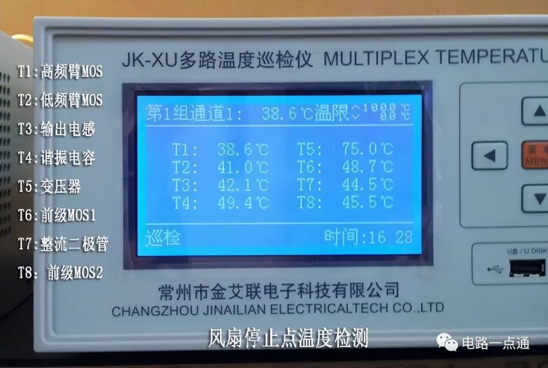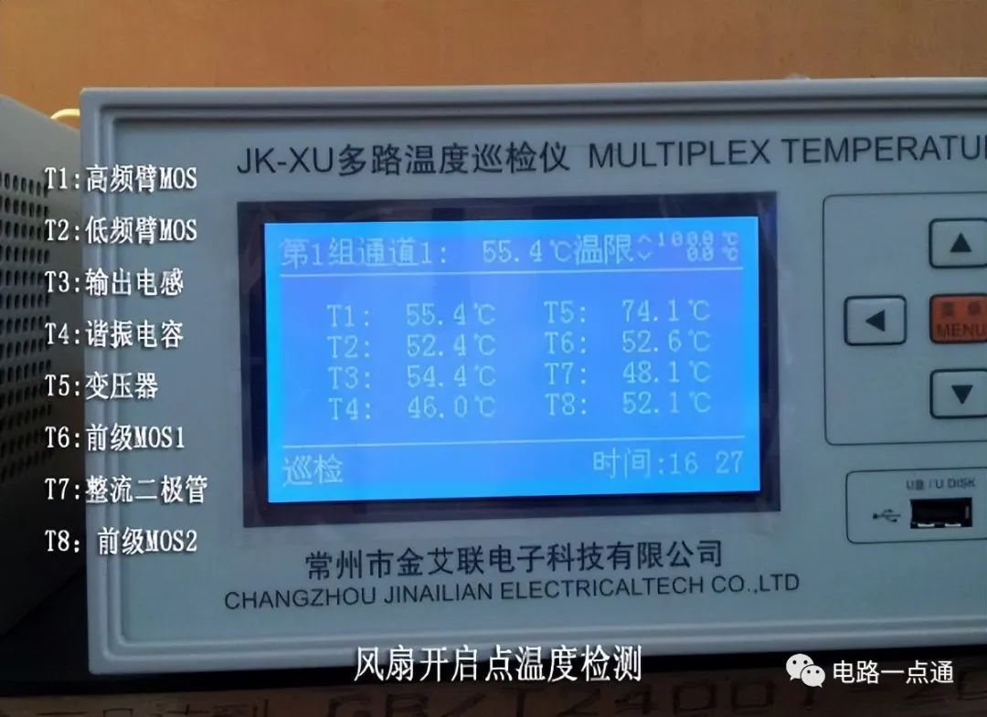 下面的照片是整机进行温升测试时的照片,用的是多点温度巡检仪: