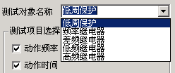 测试对象名称中包含“低周保护”、“频率继电器”、“差频继电器”、“低频继电器”以及“高频继电器”五种继电器。默认情况下选择“低周保护”。其下拉菜单如图所示: