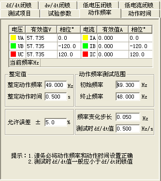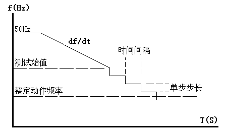 动作频率的测试方法:测试时频率分两阶段变化:开始以50Hz输出,经过变化前延时后,先按所设定的df/dt均匀下滑(或上滑)至测试始值频率,然后按设定的步长以一定时间间隔逐格降
