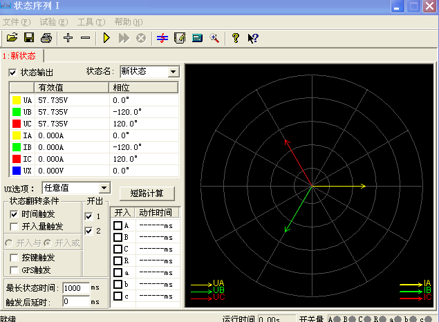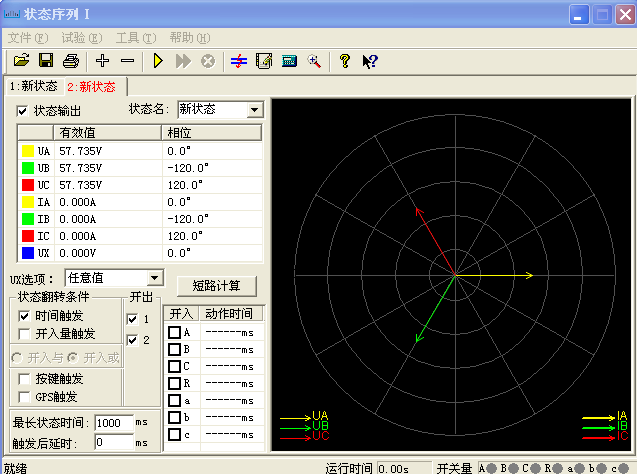 每个状态下的交流量参数均可自由设置,方法同“交流试验”。要模拟复杂试验时,还可通过打开界面上的“短路计算”功能自动计算得出,计算出的数据也可以进行修改。