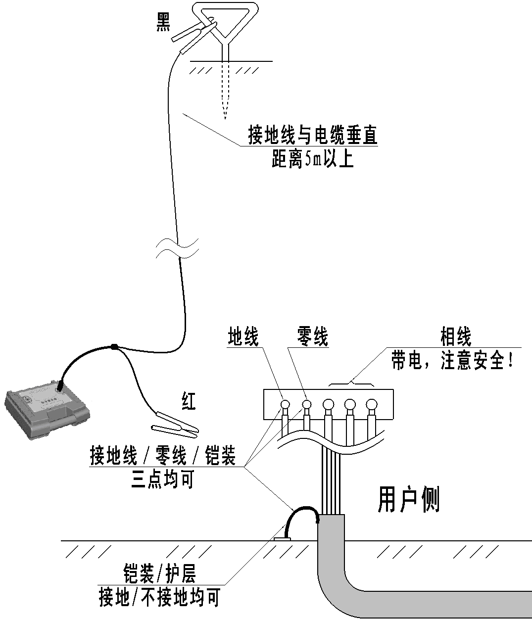 在用户端,将发射机的红色鳄鱼夹接零线、地线或护层,黑色鳄鱼夹接打入地下的接地钎,如下图所示: