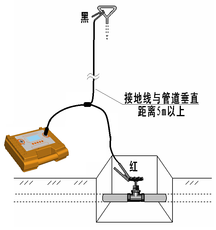 接地钎位置的选择:为保证探测效果,接地钎应与管线距离5m以上,而且黑色接地导线应尽量和管线方向垂直。