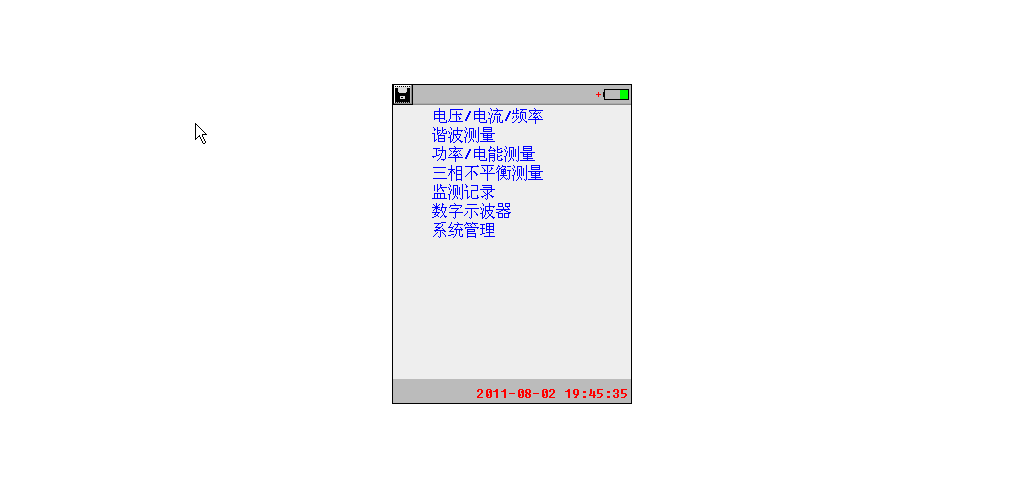 仪表主菜单如上图,屏幕上方红色显示的为仪表当前日期和时间,右上角蓝色显示的为仪表电池电量,字母”U”表示仪表当前有正确插接U盘。