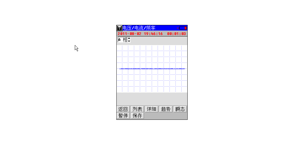 按上述方法选择进入趋势菜单,以趋势图方式显示结果,如图 1-3。用方向键移动图标至左上角的列表框上,按下Enter键则可切换显示电压趋势图、电流趋势图或频率趋势图。在电压趋势图中,由上到下依次为A相电压、B相电压和C相电压。在电流趋势图中,由上到下依次为A相电流、B相电流、C相电流和零线电流,在频率趋势图,显示的是A相频率。趋势图曲线从左侧逐步形成,趋势图基准线上的读数与曲线所绘制的最新数值相对应。趋势图低部为时间轴。