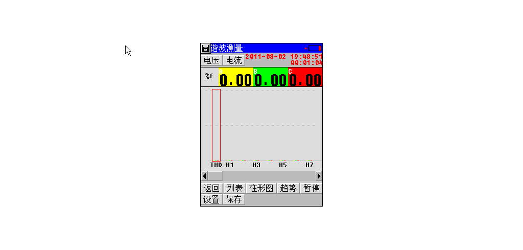 谐波测量功能可测量三相四线电系统的各相电压、电流的1~50次谐波失真百分比。