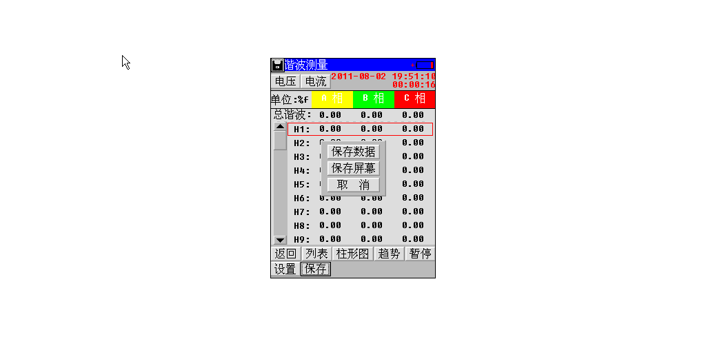 选择进入保存功能菜单,弹出下图中的界面,可选择保存数据或保存仪表屏幕。基本测量数据都保存在MMddhhmm.PQD中。MM为当前月份(几月),dd为当前日期(几日),hh为当前小时,mm为当前分钟。下同。