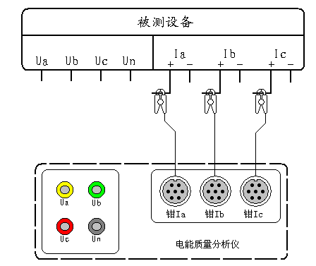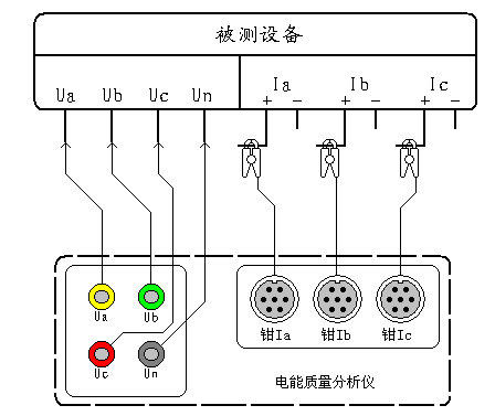 在三相四线制接线方式时用黄色导线联接被测设备的A相电压和仪器的A相电压端子、绿色导线联接被测设备的B相电压和仪器的B相电压端子、红色导线联接被测设备的C相电压和仪器的C相电压端子;三只钳形电流互感器用来测量被测设备电流的A、B、C三相,接好线后进入“测试参数”屏查看测量结果。