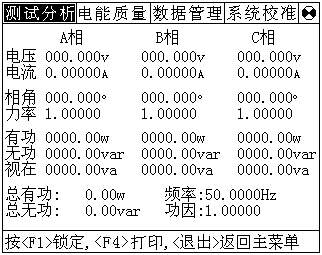 用来显示从互感器二次侧测量被测点的数据。此屏显示出当前测量的三相电压幅值Ua、Ub、Uc、三相电流幅值Ia、Ib、Ic、三相有功功率数值Pa、Pb、Pc,各相功率因数PFa、PFb、PFc,各相无功功率数值Qa、Qb、Qc,各相视在功率数值Sa、Sb、Sc,各相电压和电流之间的相角的数值,以及总有功功率、总无功功率、实测频率、总功率因数。按F1键能将当前屏幕锁定,便于读数,按F2继续刷新。按F4键可打印数据。